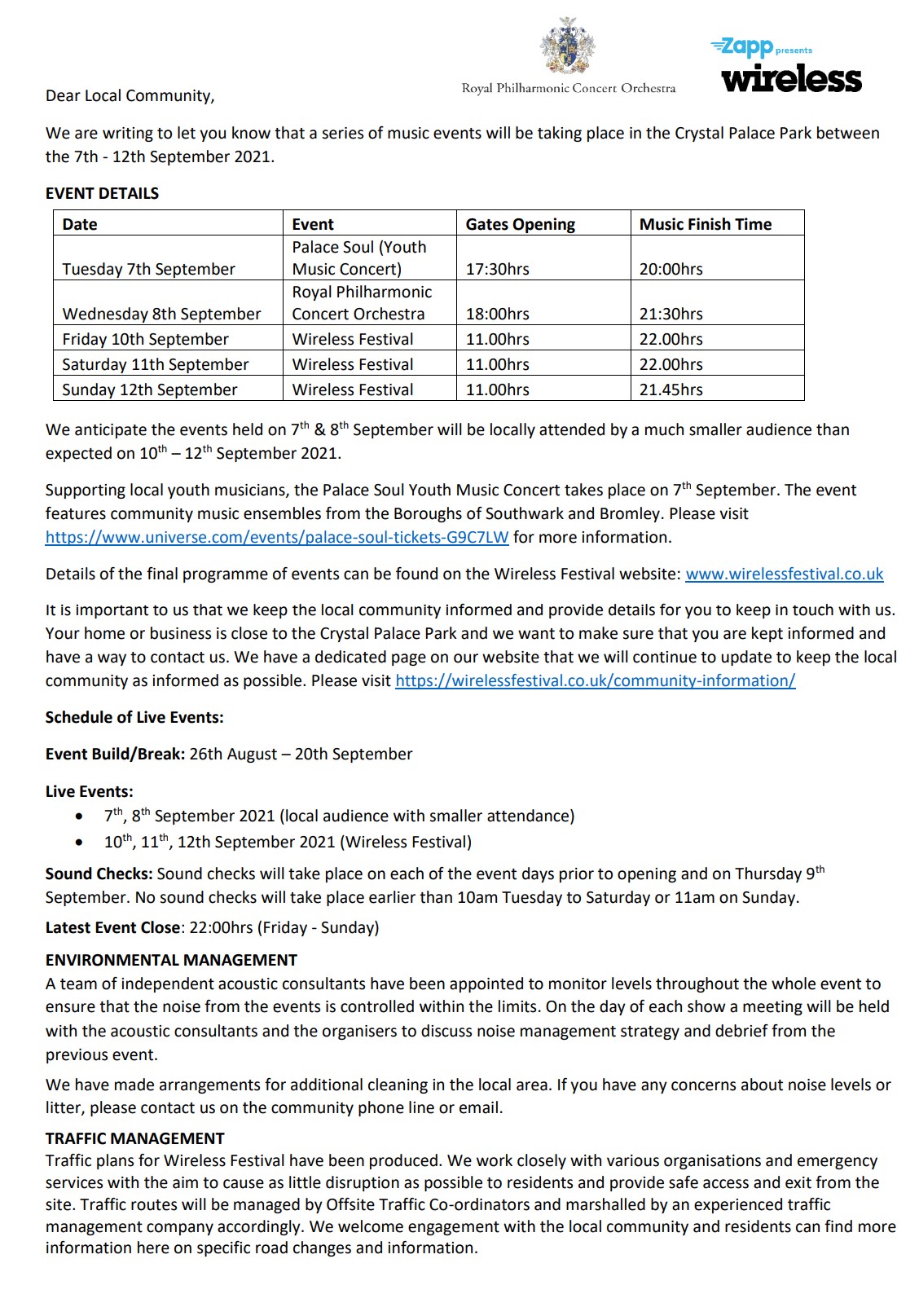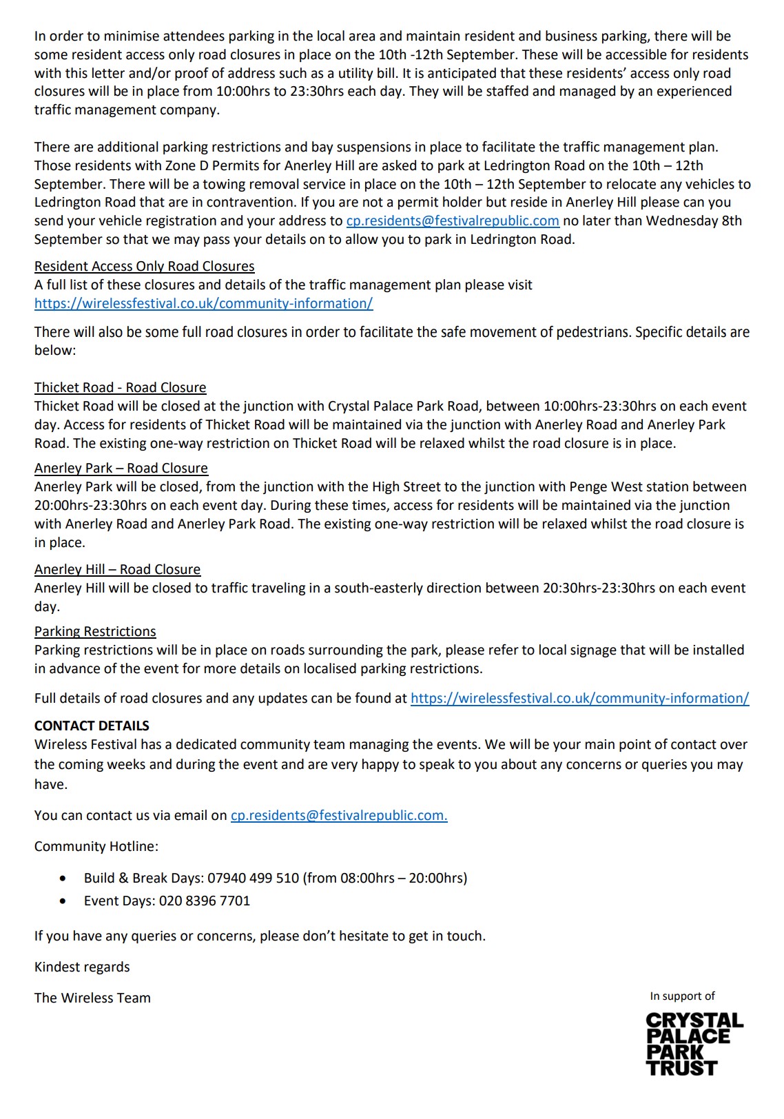 - Wireless Festival – Community Info (click link here) and open “Crystal Palace Residents Info“