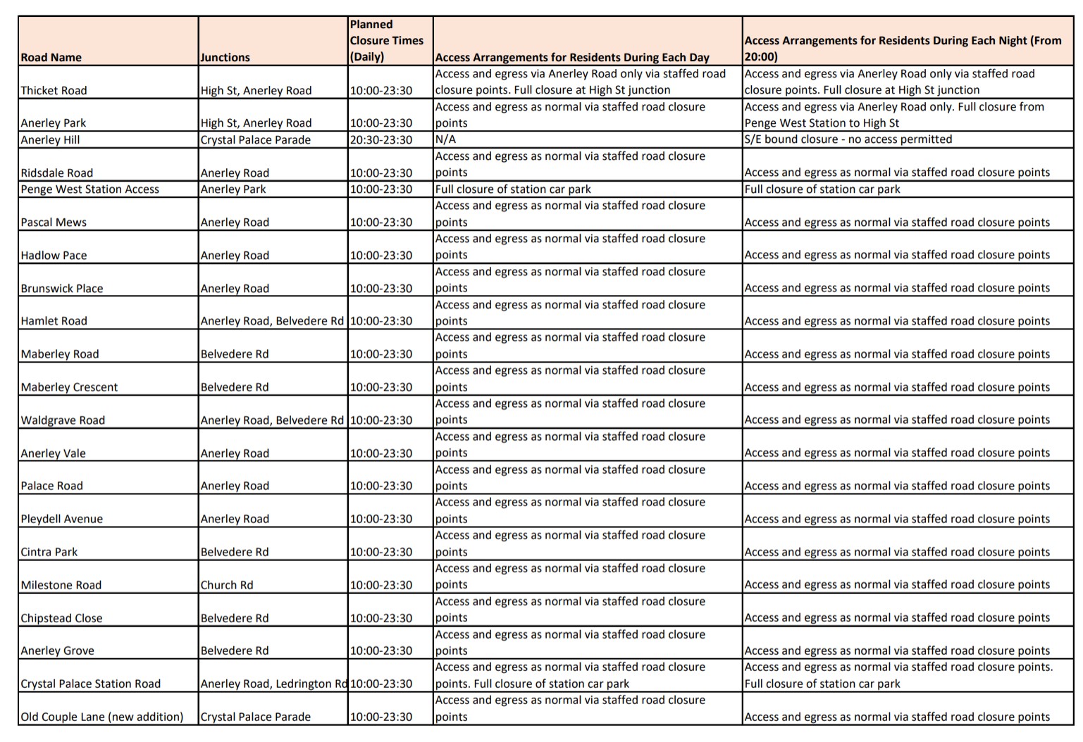 There will be 20+ road closures or access restrictions, or new parking/loading enforcements, or footway widenings around the park or local high streets. Note. Some temporary parking restrictions will have tow away patrols in operation.