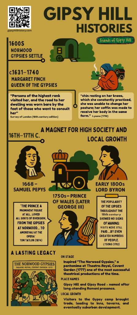 From Romani communities who gave our area its name to the railway development that transformed it, Gipsy Hill has extraordinary stories. Margaret Finch, the legendary “Queen of the Gypsies,” lived here until 1740. Samuel Pepys even mentioned our local Gypsies in his 1668 diary! Our area was famous enough that “The Norwood Gypsies” pantomime played at Covent Garden in 1777.
