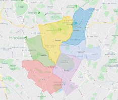 Map of boroughs bourdaires and Post Codes locations in the area, and Wards: